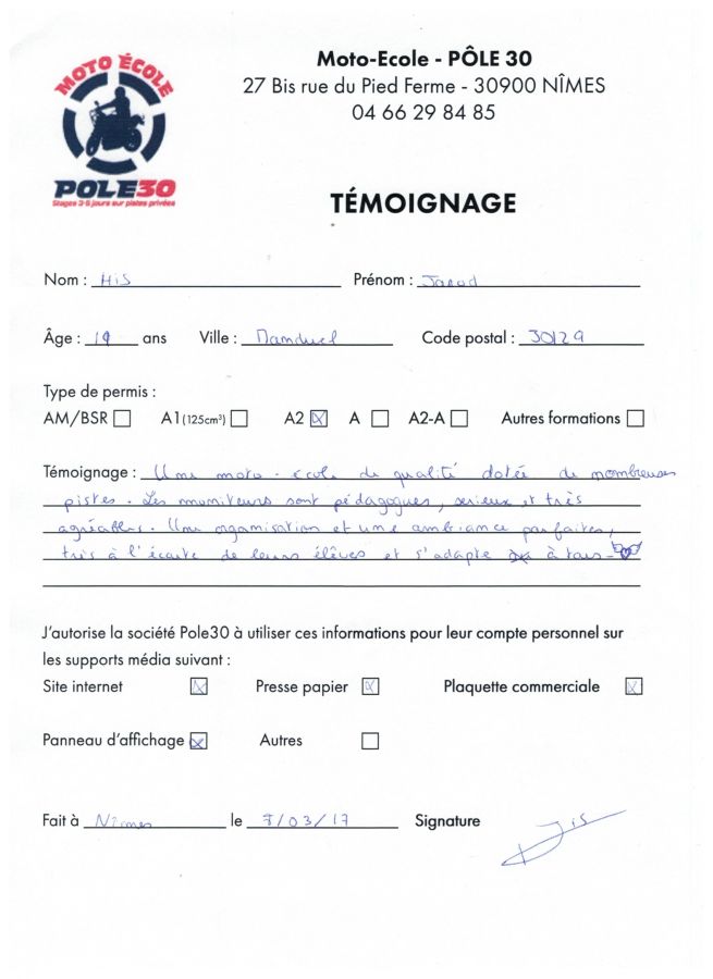 Avis sur le permis moto A2 de M. HIS Jarod de Manduel (30129-Gard)